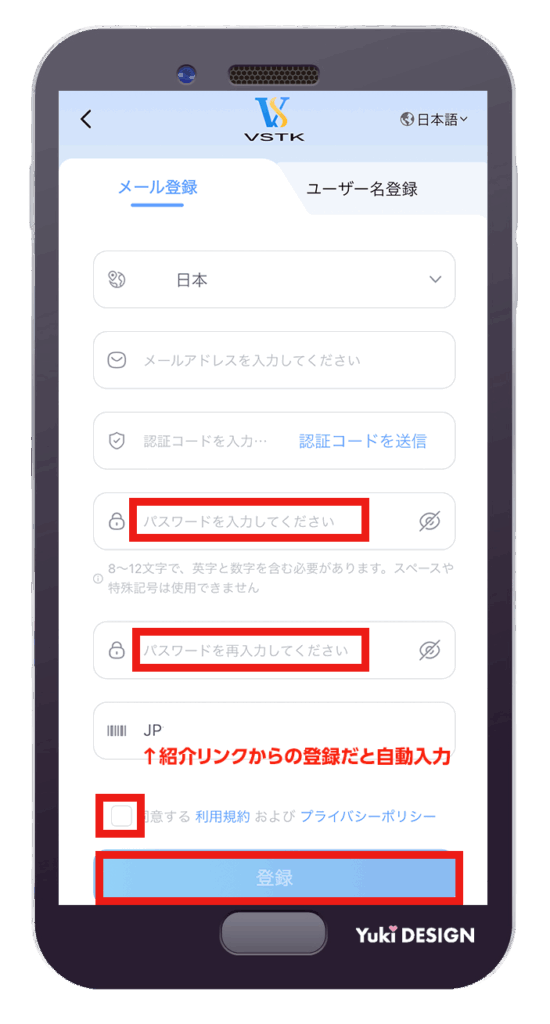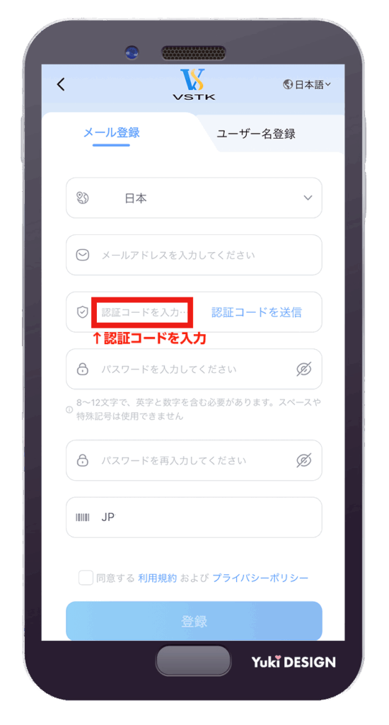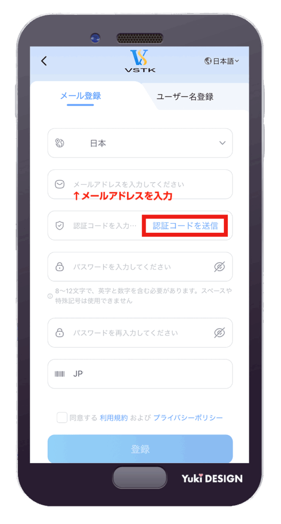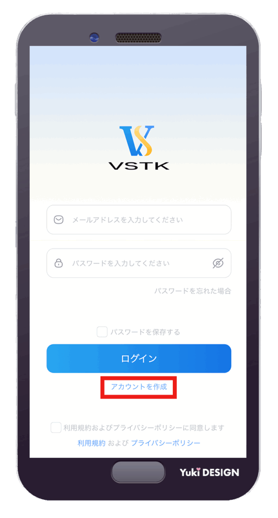 メールアドレスとパスワードは、VSTアプリのログイン情報になります。