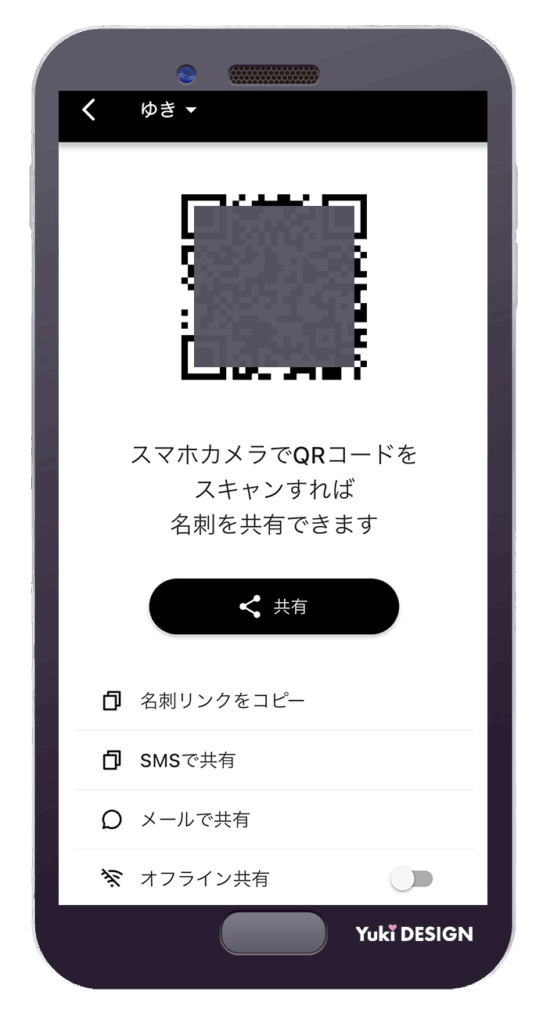 QRコード、名刺リンクをコピー、SNSで共有、メールで共有など好きな方法でシェア