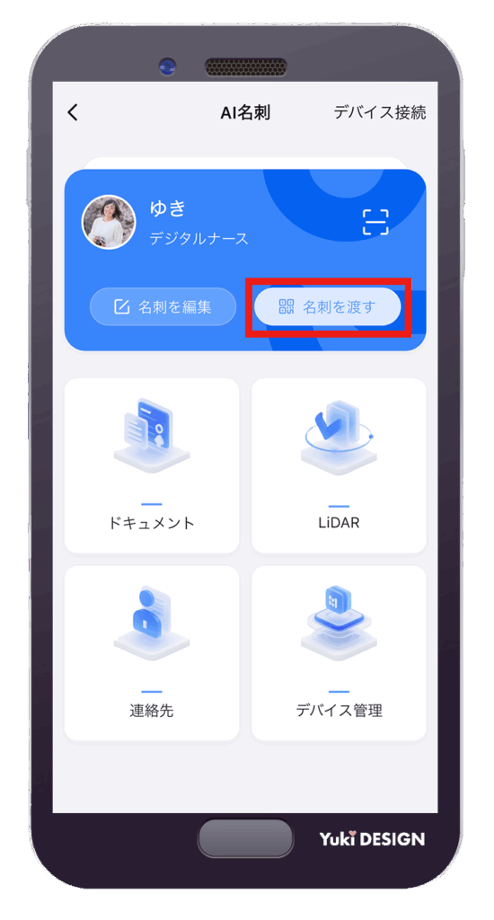 専用アプリと連携することで、名刺交換・プロフィール表示・AI機能などがスマホ上で使えるようになります。